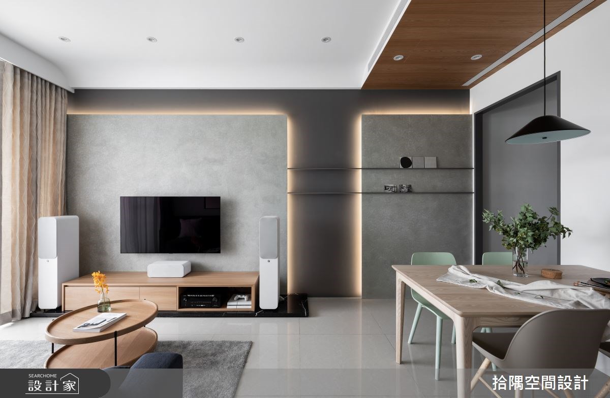 間接照明在住宅空間中,被大量運用在需要放鬆的客廳天花板的燈光設計,見光不見燈具的反射手法,營造柔和均勻的照明效果,視覺空間顯得簡潔美觀。除了應用於客廳天花板,間接照明也被廣泛使用於收納櫃下緣、梯階、化妝鏡等。而設計師也將接間照明優勢加以發揮,融入電視牆設計上,如透過間接照明的光束框架出電視牆造型、在牆體溝槽注入層次感間接光帶、結合收納櫃在隱形把手開門位置打光等極具巧思的設計,替電視牆增添層次,也緩和了大面積牆體的沉重,注入客廳更柔和輕盈的氛圍。