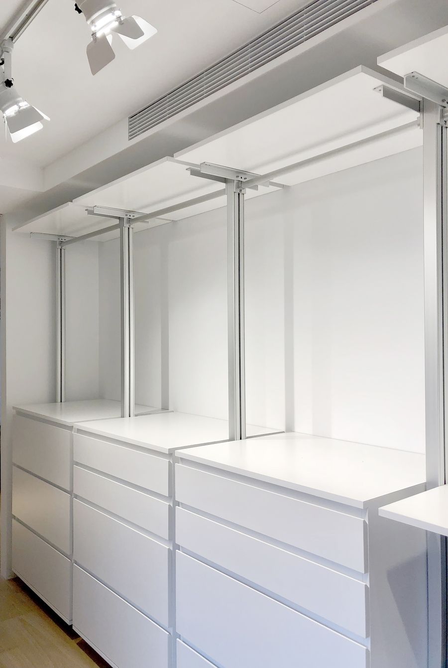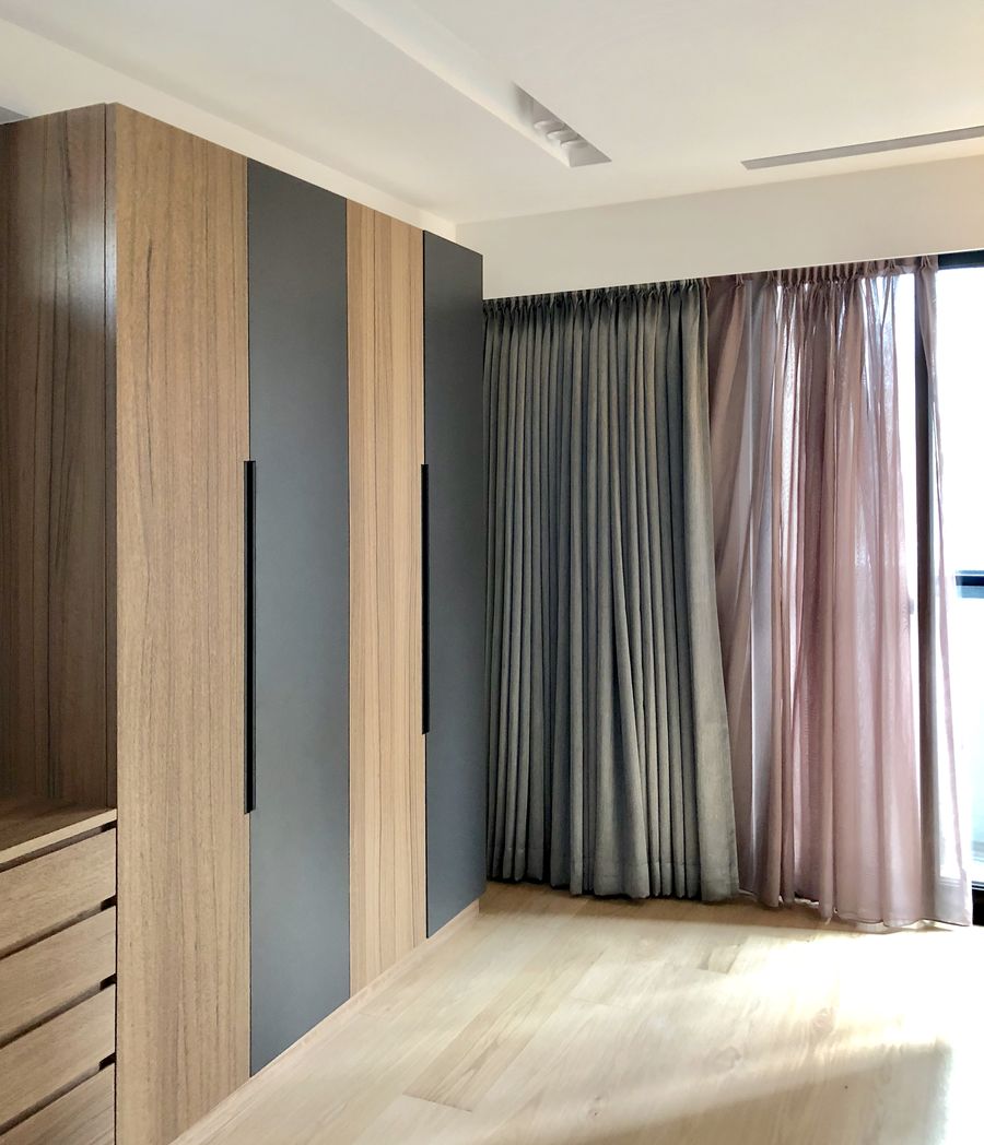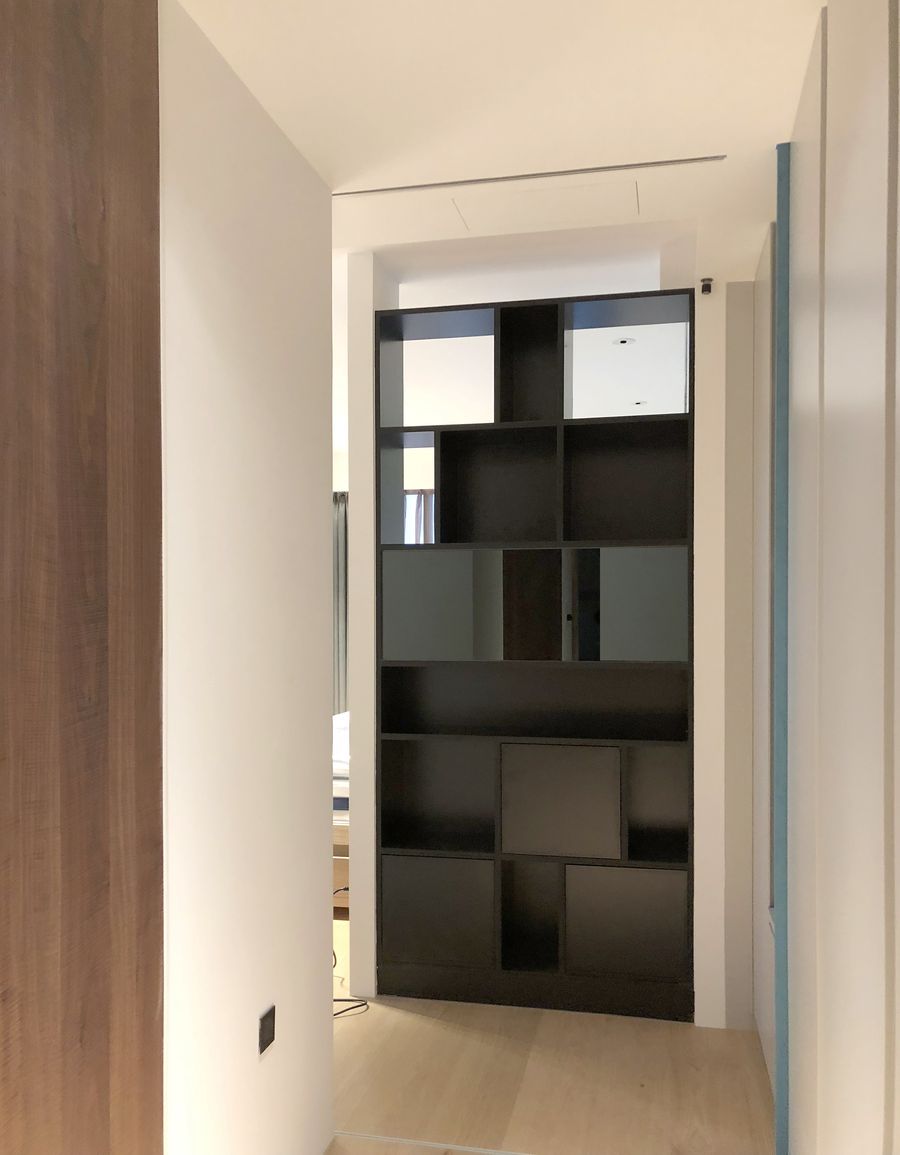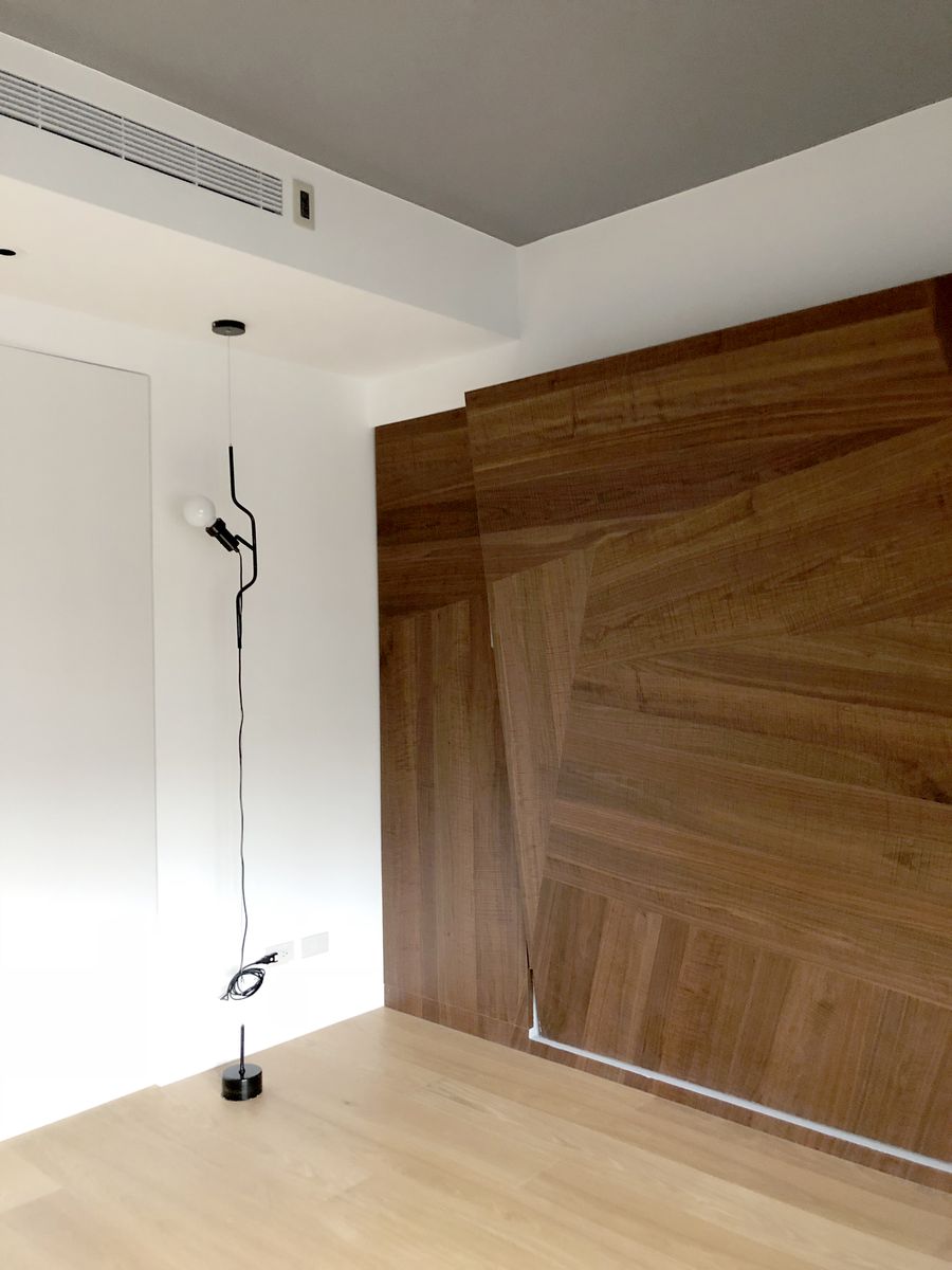 本案最大改變在於將原始3房調整為2房,消失的1房併入主臥室內,使其具備條件規劃獨立更衣室與獨立浴室,創造舒適且開闊的休憩睡眠品質。而為滿足風水要求,主臥室床頭必須不壓樑、不靠窗、背靠牆(代表有靠山),且位處東西向,同時因應屋主命格,房內不能太過明亮,所以設計師挑選了全遮光窗簾,可自由控制戶外映入房內的光線強弱。另外在床鋪與房門之間也設置一座展示櫃,以免入門煞氣與主人相冲。