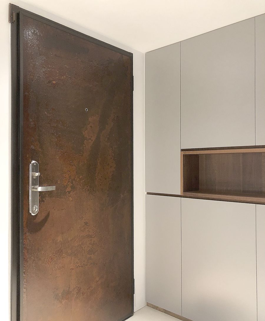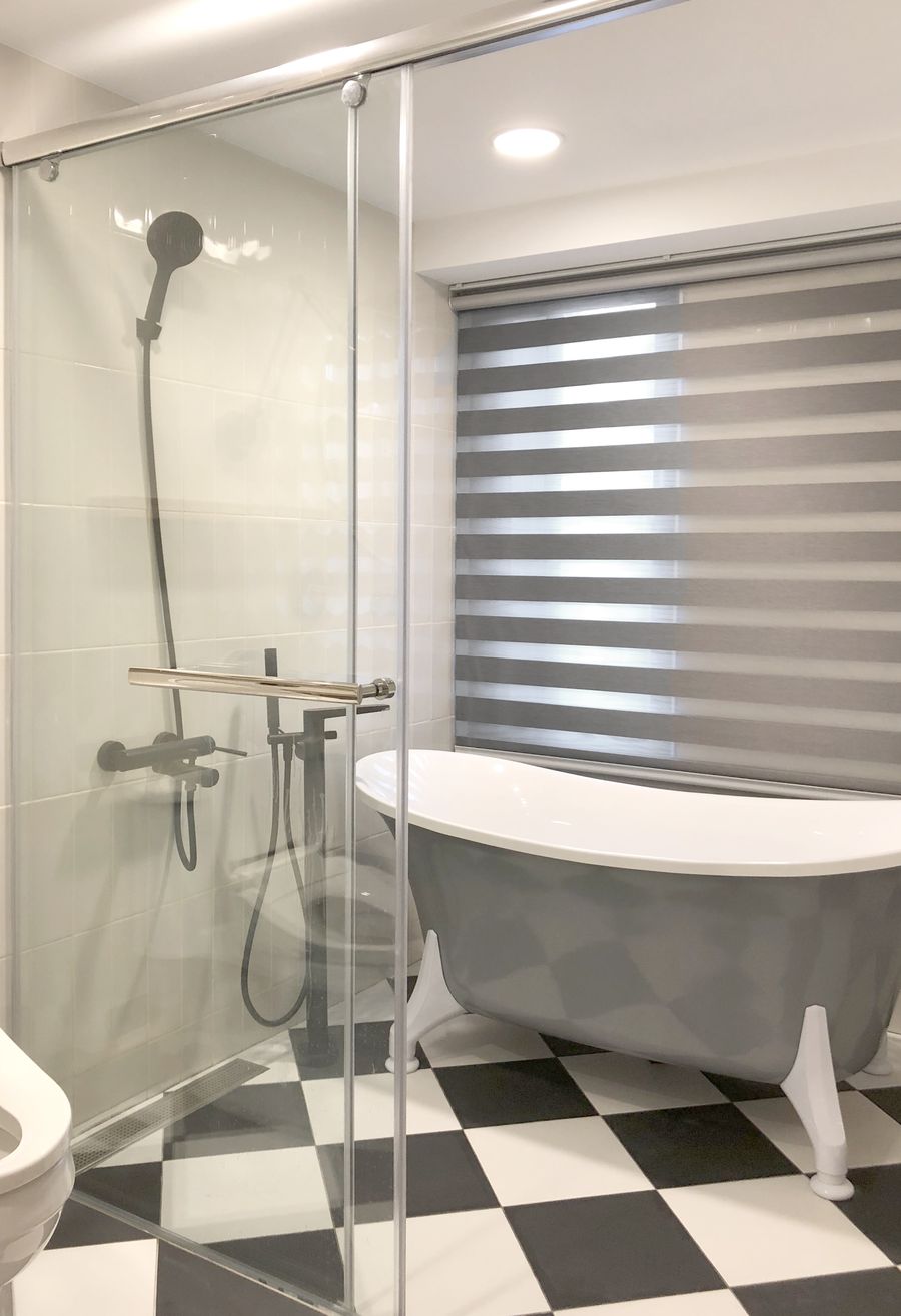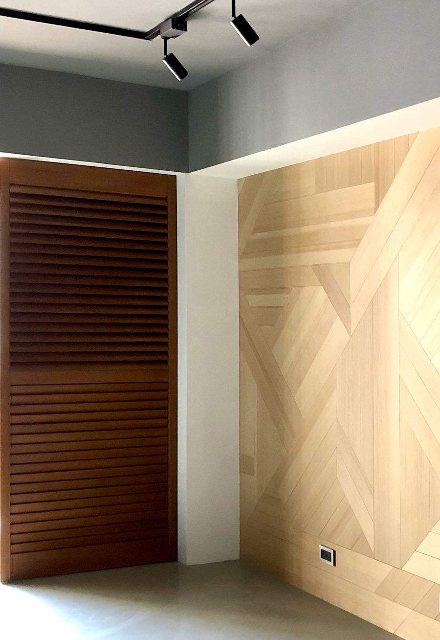 此外,本案正對別棟大樓的牆角,恐面臨壁刀煞干擾,對居住者造成無形生理/心理壓力,於是在前陽台加裝格柵先行阻擋,並於客廳落地窗前再次架設木拉門,進一步強化擋煞效果。設計師的貼心思維還不止於此,由於陽台、客廳、餐廳、廚房處在同一直線上,因此針對獨立廚房也安裝玻璃拉門,除了保有穿透輕盈視覺感受與避免油煙溢出之外,更藉此與公領域的防煞機制前後呼應。