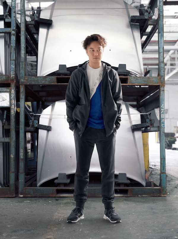 Eason穿上藍灰拼色短袖T恤和純黑色運動褲,外搭同色系的連帽風褸,配上獨特襪套式EQT Support ADV,打造富現代感的街頭運動造型。
