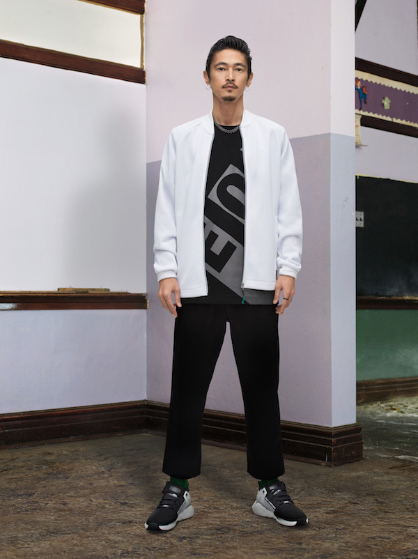 日本男星窪塚洋介身穿黑色短袖T恤和運動褲,短袖T恤的Logo與他腳上的EQT Support 93/17 互相呼應,一身深沉色系打扮輕易將外搭的白色外套突顯,簡約有型。