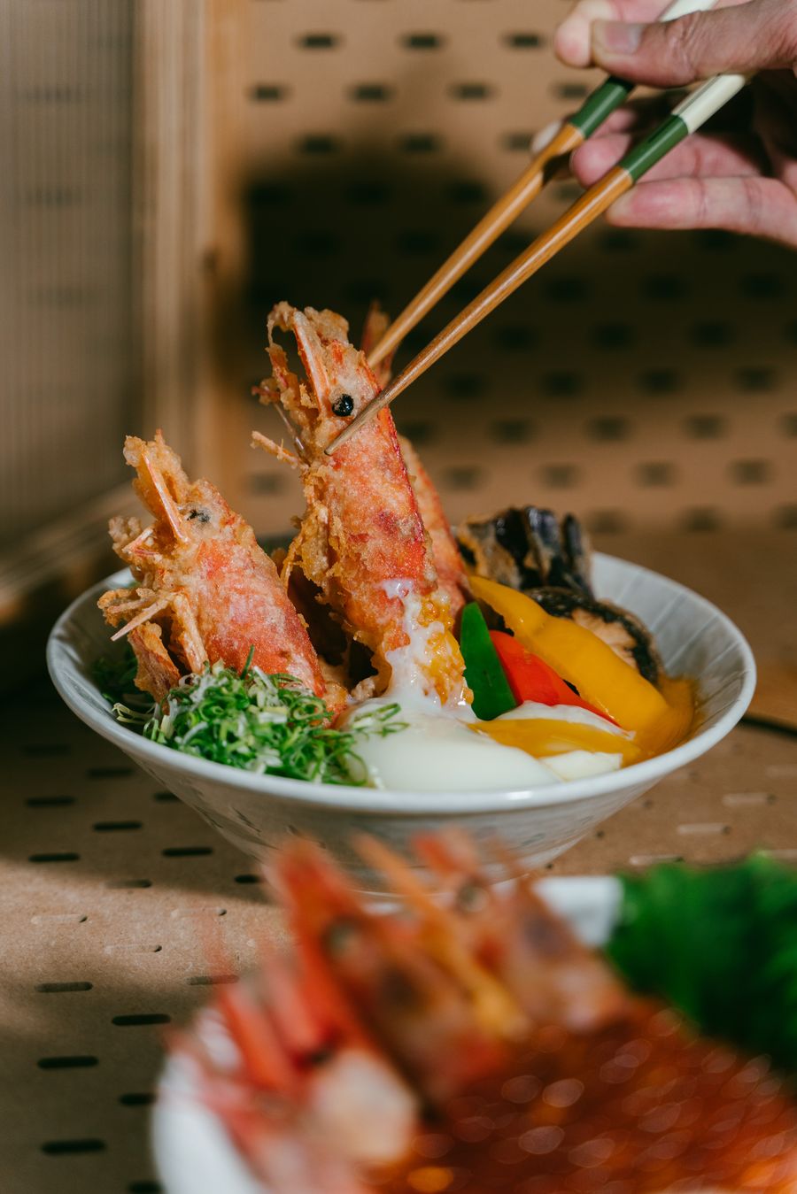「極上天丼」則以泰國軟殼蝦整尾帶殼油炸,主廚特調麵漿酥炸,麵漿裹得恰到好處,薄而酥脆不油膩,丼飯基底為壽司米,黏性恰好有嚼勁且口感香甜,天婦羅中使用台農57號黃、紫地瓜等小農蔬菜,漂亮雕花的小細節讓整碗丼飯更加分!最療癒莫過於選用土雞蛋料理的溫泉蛋,濃郁滑嫩的蛋黃流淌在晶瑩的壽司米上,與軟殼蝦、天婦羅完美契合,讓美味加分,每一口都過癮。