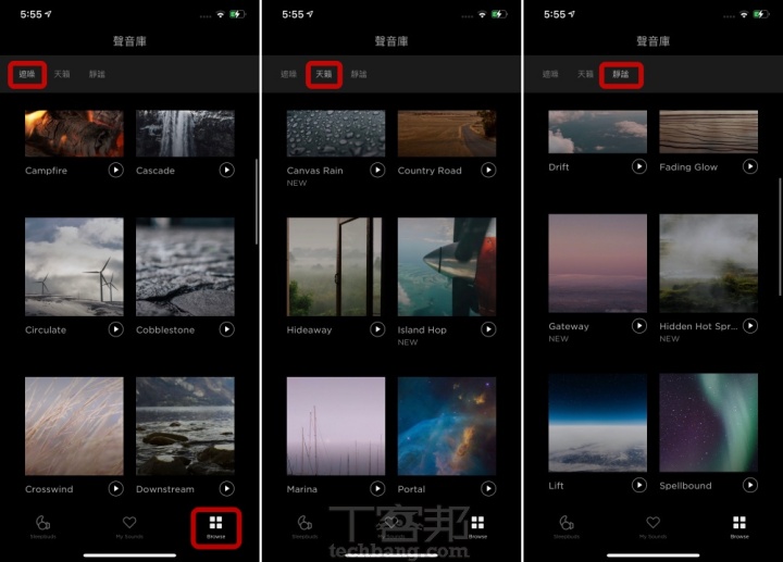 ▲ 在 App 聲音庫頁面裡可讓使用者自行新增和下載音效至耳塞中,一旦耳塞儲存空間達上限,這時若要再新增音效內容,系統勢必會刪減已儲存在耳塞內的歌曲,來回處理需要花費一點等待時間。而現階段聲音庫共分為遮噪、天籟和靜謐三種音效類別,其中遮噪主要是白噪音、助眠音,用以掩蓋干擾睡眠的噪聲;天籟類別別則代表大自然中的聲音;靜謐則囊括能幫助用戶平靜下來的輕鬆音調。目前原廠提供了 50 多首音效供選擇,未來也將透過軟體更新方式加入更多紓緩與遮噪聲音。