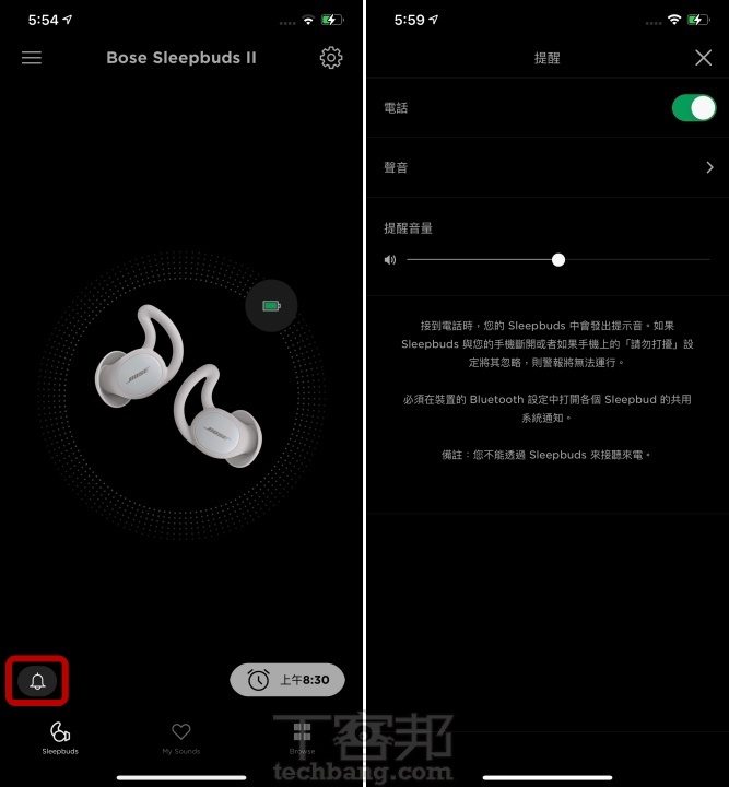 ▲ 為了避免配戴耳塞睡覺而錯過重要電話的情況,App 中也具備「電話提醒功能」,當啟用該功能後,當手機一有來電耳塞立即會發出如同鬧鐘的聲音叫醒你,不過前提是必須確保耳塞與手機裝置保持連線才行。