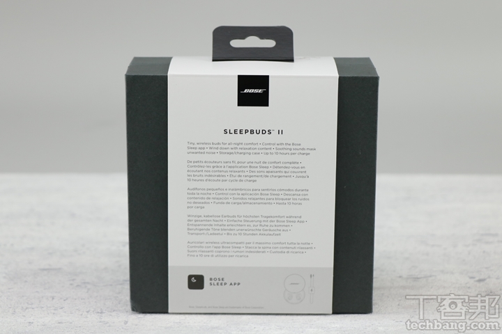 ▲ 盒裝背面則以五種語言標示出產品重點,以及專屬的 Bose Sleep App。