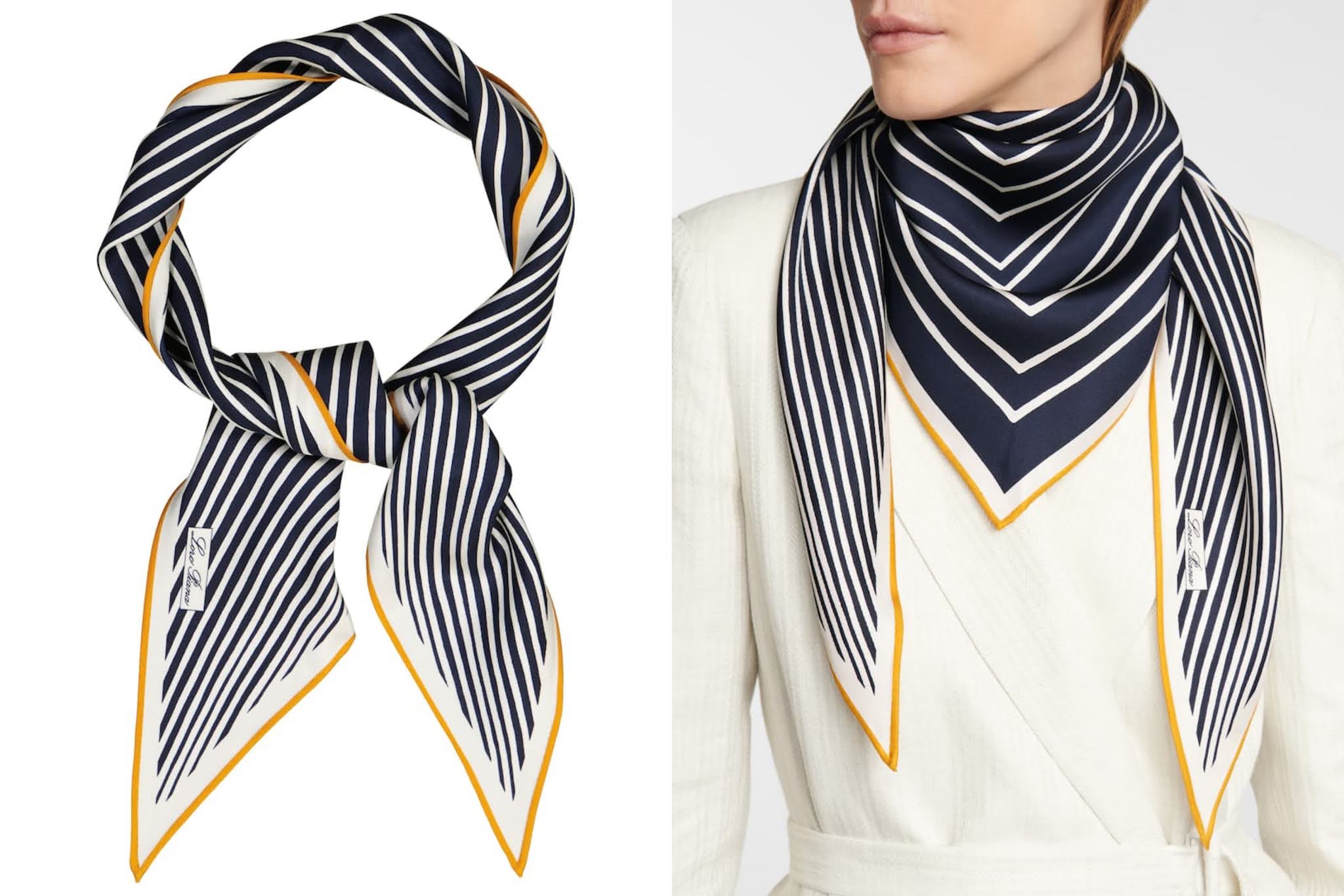 以高級羊毛面料製作起家的義大利精品品牌 Loro Piana,受到時尚圈眾多名人喜愛,像是碧昂絲、安潔莉娜裘莉都是他的粉絲之一,除了羊毛圍巾、羊毛開襟衫等等熱門單品之外,Loro Piana 也有推出絲巾,深藍色的細條紋搭配鵝黃色的滾邊設計,間距不同的平行線讓整體設計更有層次感。喜歡簡約穿搭的媽媽用上這條絲巾絕對能讓造型更亮眼!