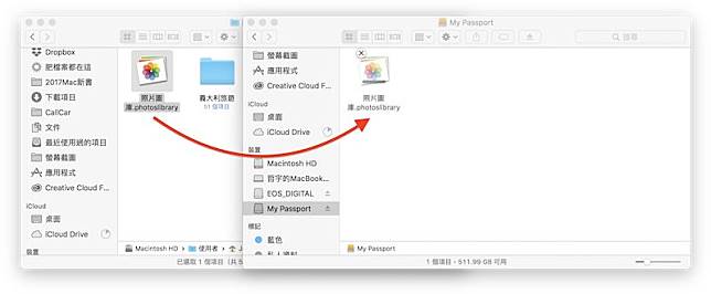 先到「使用者名稱 > 圖片」的路徑,把「照片圖庫.photolibrary」丟到外接硬碟中,這步驟是把電腦裡的照片抓到外接硬碟: