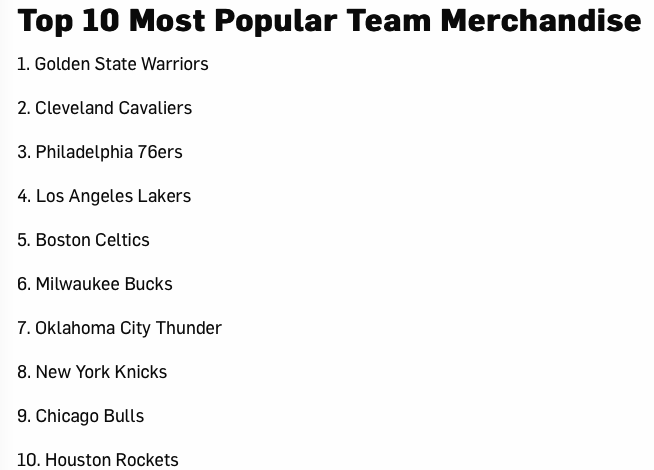 球隊方面,最值得關注的是費城76人的球隊產品銷售更超越湖人隊進佔第三,隊中兩名主力Ben Simmons及Joel Embiid絕對功不可沒,他們在個人球衣銷售排名也分列第7和第10!
