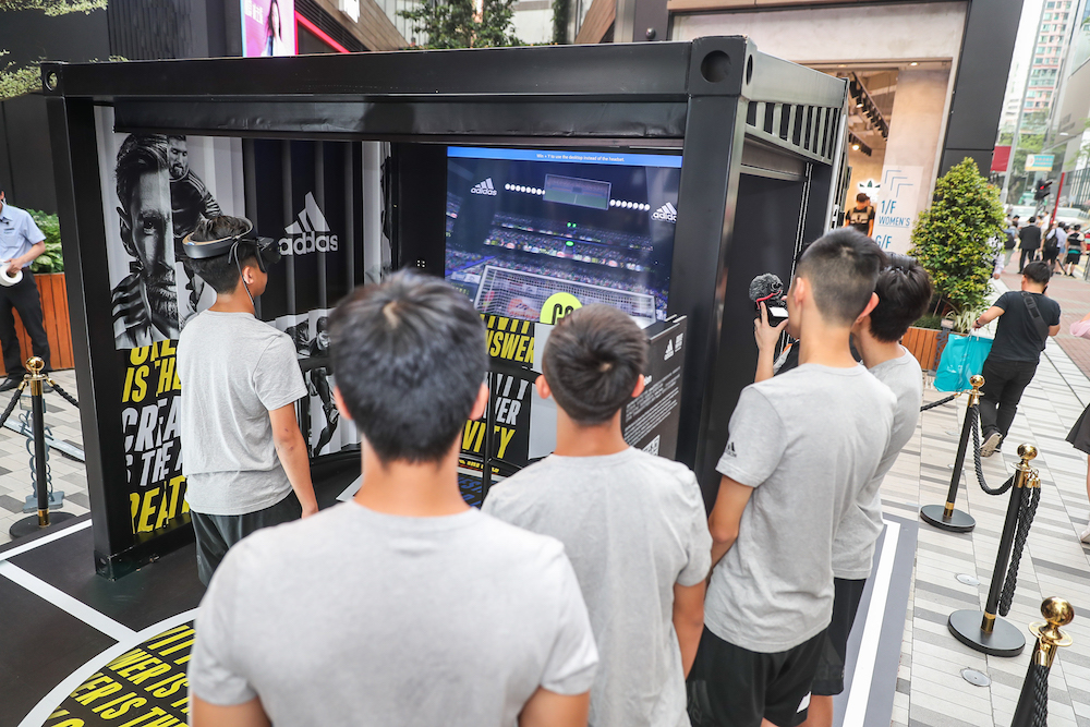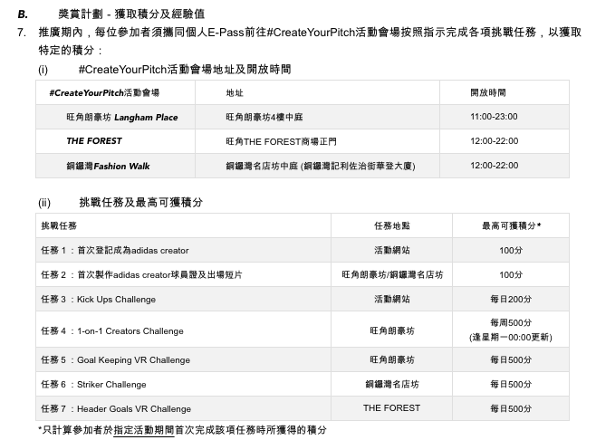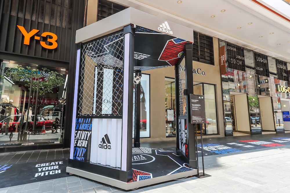 位於朗豪坊的adidas「Create Your Pitch」足球競技場設在四樓平台位置,當中設有多項指定任務供一眾參加者作對戰,包括「1-on-1 Creator Challenge」足球場;參加者可挑選自己專屬的足球競技場設計,對戰時間為三分鐘,龍門位置更可讓Creators任意擺放,組合不同難度的足球場,完成任務就會獲得積分。