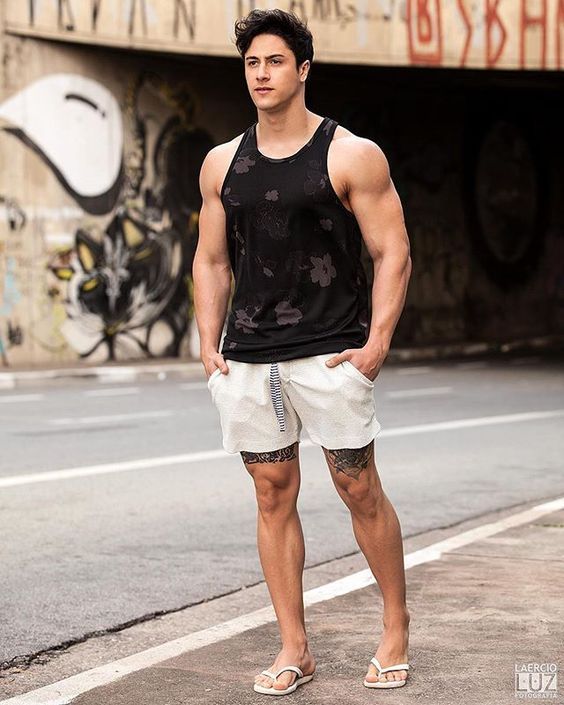 男士的穿裝重點,就是要有整潔的感覺,簡單一件黑色背心,能讓你顯露自信的手臂線條,而且方便易襯,加上拖鞋就能出門了!