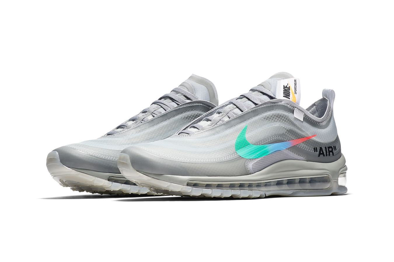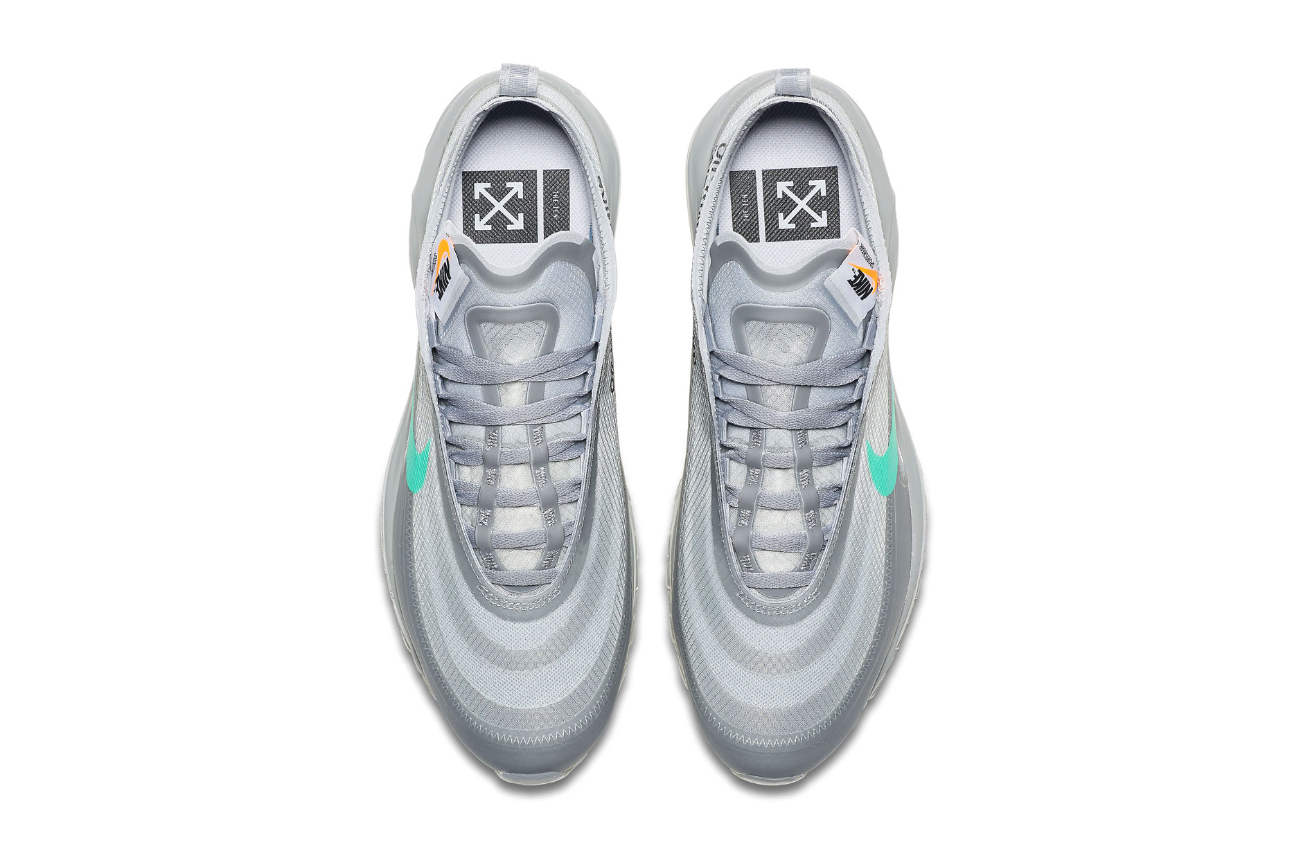 新版 Off-White x Nike Air Max 97 推出新配色「Menta」,採用特殊的半透明紗線材質,而鞋側加入了彩色漸變效果的 Swoosh ,而logo下亦加入了“AIR”和“SHOELACES”的字樣。