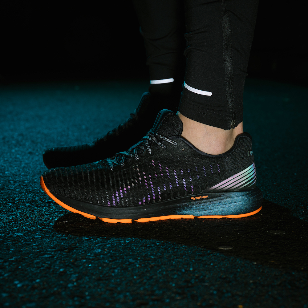 鞋面採用無縫線透氣網面,讓跑者在完成長距離跑步後,雙腳依然保持清爽。鞋身和logo上就用上反光設計,能增強夜間的辨識度!