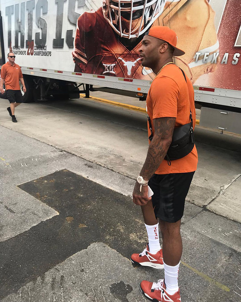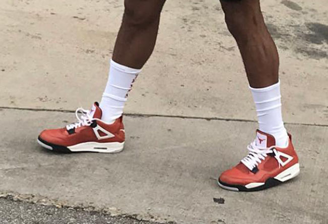 P.J. Tucker在近日的露面上,穿上一雙Air Jordan 4全新未知配色!身著橙色德州大學長角隊T-Shirt的P.J. Tucker在回校看比賽時,穿上一雙黑白紅Air Jordan 4,而且鞋跟以及鞋舌的Logo是完全倒著的!