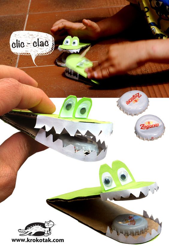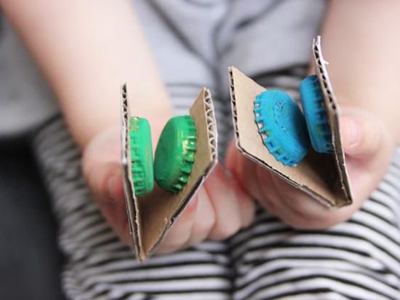 △ 爸爸媽媽喝完啤酒蓋或汽水蓋,貼在一條大約10cm的紙條上,然後中間對摺,就可以成為樂器。