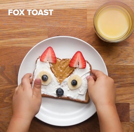在麵包上面塗上花生醬,和在剩下的部分塗上忌廉芝士,加上兩片香蕉、三粒藍莓,和兩片士多啤梨,就可以變成狐狸麵包。