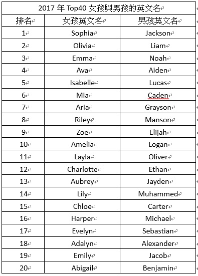 外國網話選出本年最多人用的頭30個的女孩與男孩的英文名,不知道有沒有爸爸媽媽們的心水呢?