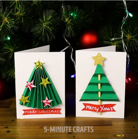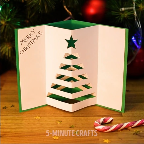 將卡紙對摺,並在裡面畫上聖誕樹,然後跟著聖誕樹的圖案切割,再黏上另一張卡紙上,就可以製成立體聖誕樹的卡。