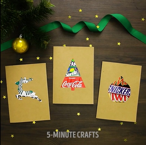 在卡紙面切割成聖誕樹、聖誕球、聖誕鹿等等的圖案,在卡紙與卡紙中間,放入招紙,就可以製成有顏色,獨一無二的招紙圖案聖誕卡。