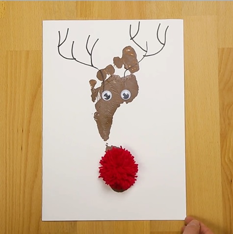 先預備和摺好白卡紙,在腳底塗上鹿的顏色,一腳踩到紙上,等到乾後就可以為鹿畫上鹿角,和貼上紅鼻子和眼睛就完成啦!