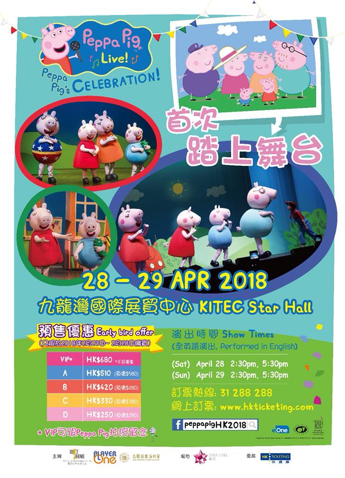 Peppa Pig相信各位小朋友與家長都不會陌生的卡通人物,第一次接觸英文,大多數的小朋友,都是由Peppa Pig這裡開始的。來臨的4月,Peppa Pig首次的踏上香港的舞台,舉辦Peppa Pig’s Celebration音樂劇,與觀眾們唱歌跳舞大玩遊戲喔!