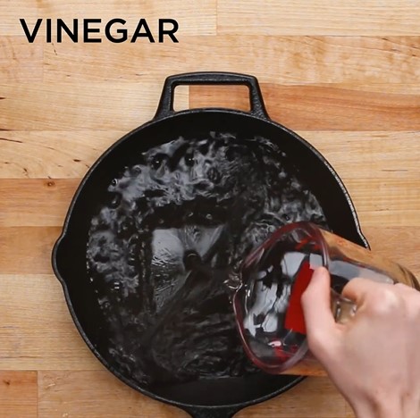 2. 在生銹的鍋上倒入白醋,浸泡過夜,一夜後沖洗就可以。