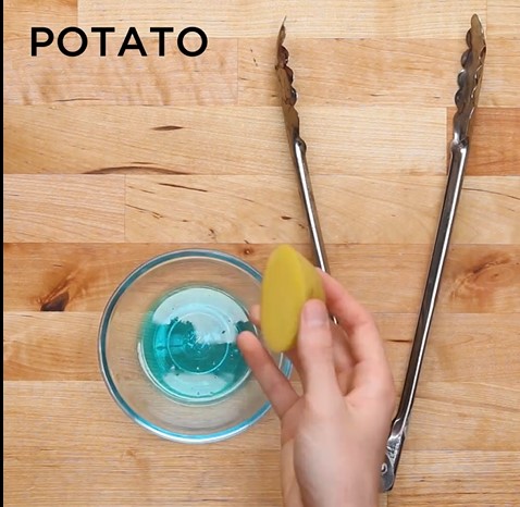 3. 將薯仔切出一片,然後沾上洗碗用的清潔劑,然後在生銹的地方清洗就可以了。