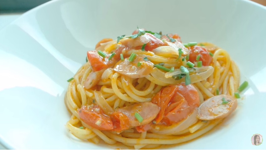 2. 先將番茄、香腸、洋蔥、蒜放份平底鍋中,再加入意粉、番茄醬、水和油,煮12分鐘。