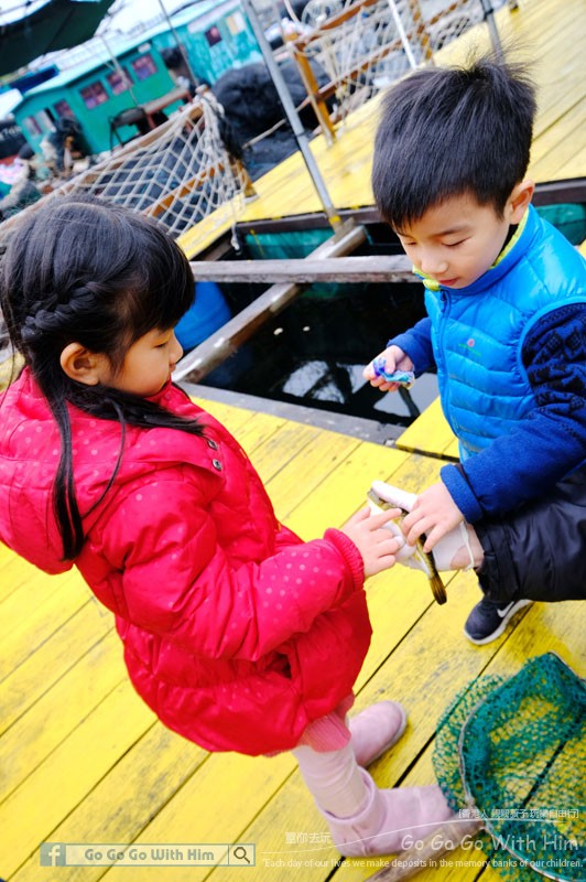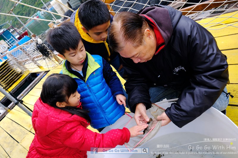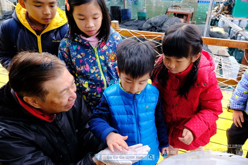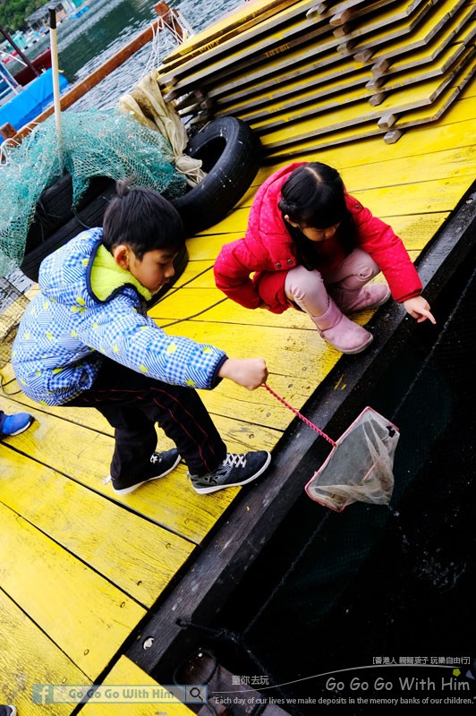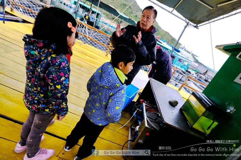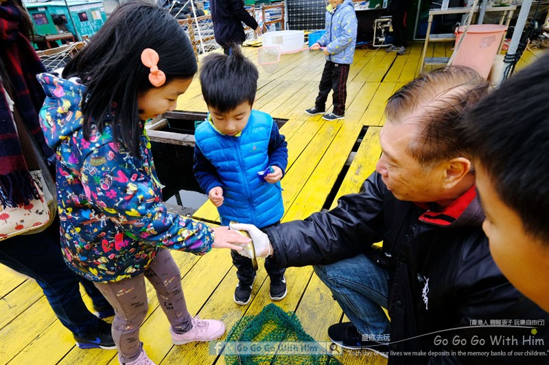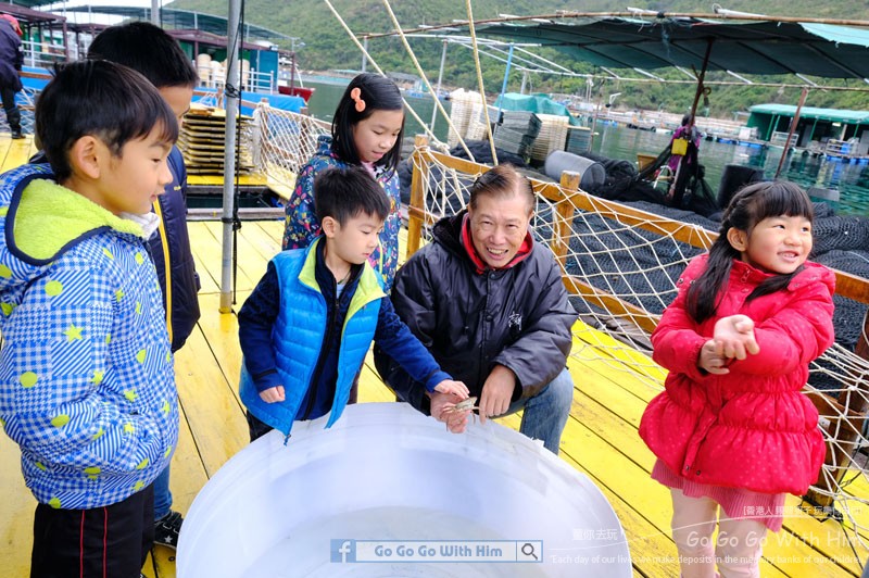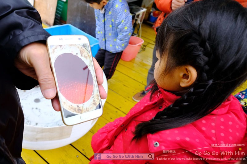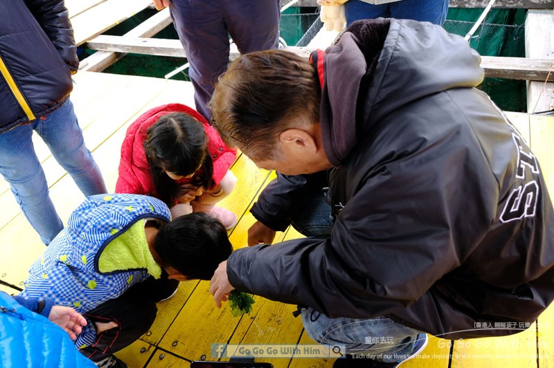 一到埗,船長九叔便取出魚糧讓小朋友餵魚,超興奮!