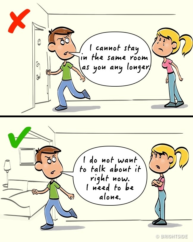 在吵架過程中,離開房子,只會讓對方感覺不舒服與「放棄」,如果真的想冷靜一下,就別離開現場,先到另一個房間中,各自的冷靜一下,然後再討論,這樣會比較好。