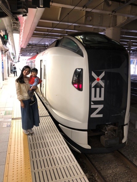 先從機場搭乘成田特快Narita Express(簡稱N’EX)前往新宿,這是最快可以由機場到達新宿的方法(約1.5個小時)。可以先買來回車票,只需要$4000円,小孩6歲以下不佔位子的話則是免費。