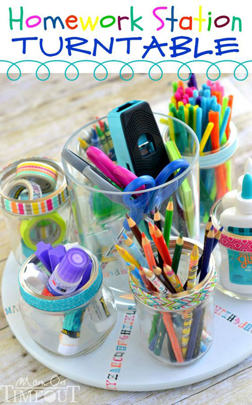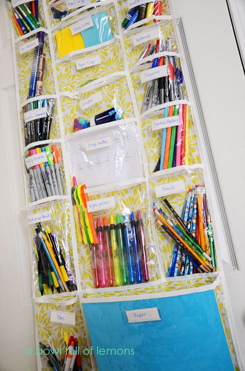 1. 用掛牆透明袋、6層拉櫃、透明瓶子等器皿,把孩子的文具分門別類,清楚地收納好;當孩子要在家做功課或勞作時,也就能快速找到相應工具啦~2. 假如家中空間沒有那麼多,也可以把孩子的文具放到收納袋子裏,比較省位~ 可是文具袋最好跟孩子帶回校的筆袋分開,這樣就可以避免孩子把筆袋遺留在家了!