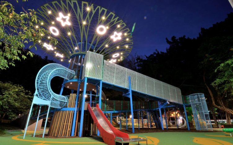 公園裡的「天空樹遊戲場」有三種溜滑梯,有3.5公尺高的螺旋滑梯,也可以利用鑽籠攀爬或經由無障礙斜坡,挑戰高達4.5公尺的管狀滑梯。此外,還有不同高度的攀爬體驗設施、以及平面及斜面式吊梯等等設施,讓小朋友玩樂中也訓練穩定度。這個遊戲場屬於全共融的設計,並首次讓身心障礙的小朋友也能深達至4.5高的滑梯可以體驗高空溜滑。