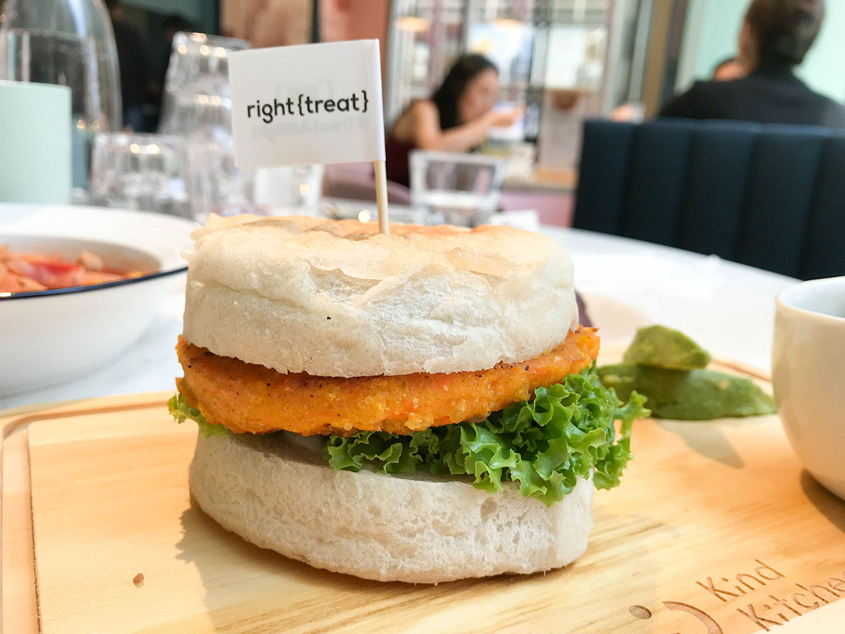餐廳也有提供幾款全素兒童餐,價位由$72-$78包括有主菜、香甜蕃薯、泡沬杏仁奶或熱豆漿,楊小寶點的是紅寶漢堡,是一款以紅菜頭製作的漢堡。