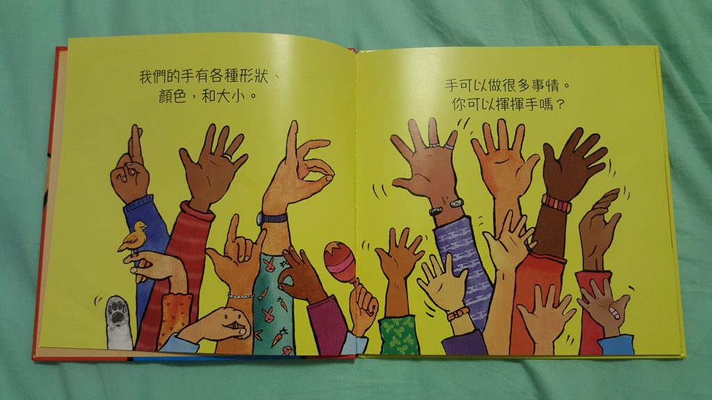 書中就是說明手就是很有用的,我們可以用來握手寫字畫畫幫助別人擁抱等。