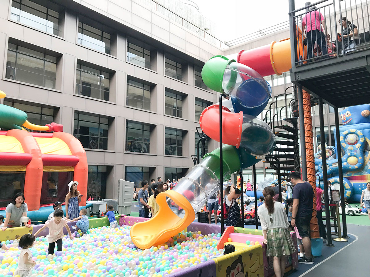露天廣場不只有賽車跑道,還有彩虹溜滑梯、藍寶機器人氣墊溜滑梯、朵朵跳跳床、兒童遊戲室。