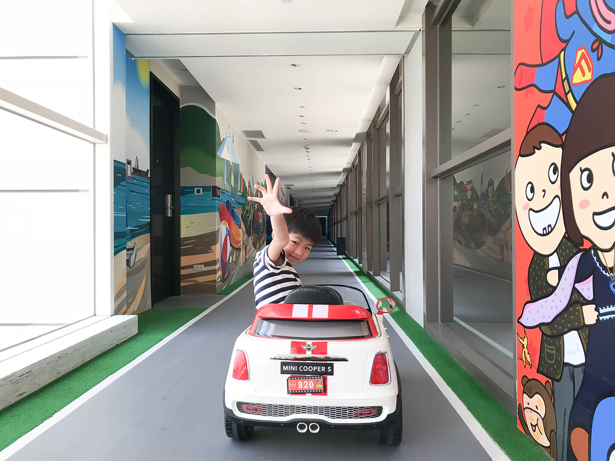 露天廣場開放時間為9am-11am & 3pm-8.30pm,只供住客使用。當然喔,如果不住在芬朵奇堡主題房,也可以來這裡玩,只是不會有專屬自己的電動車在入住樓層玩。