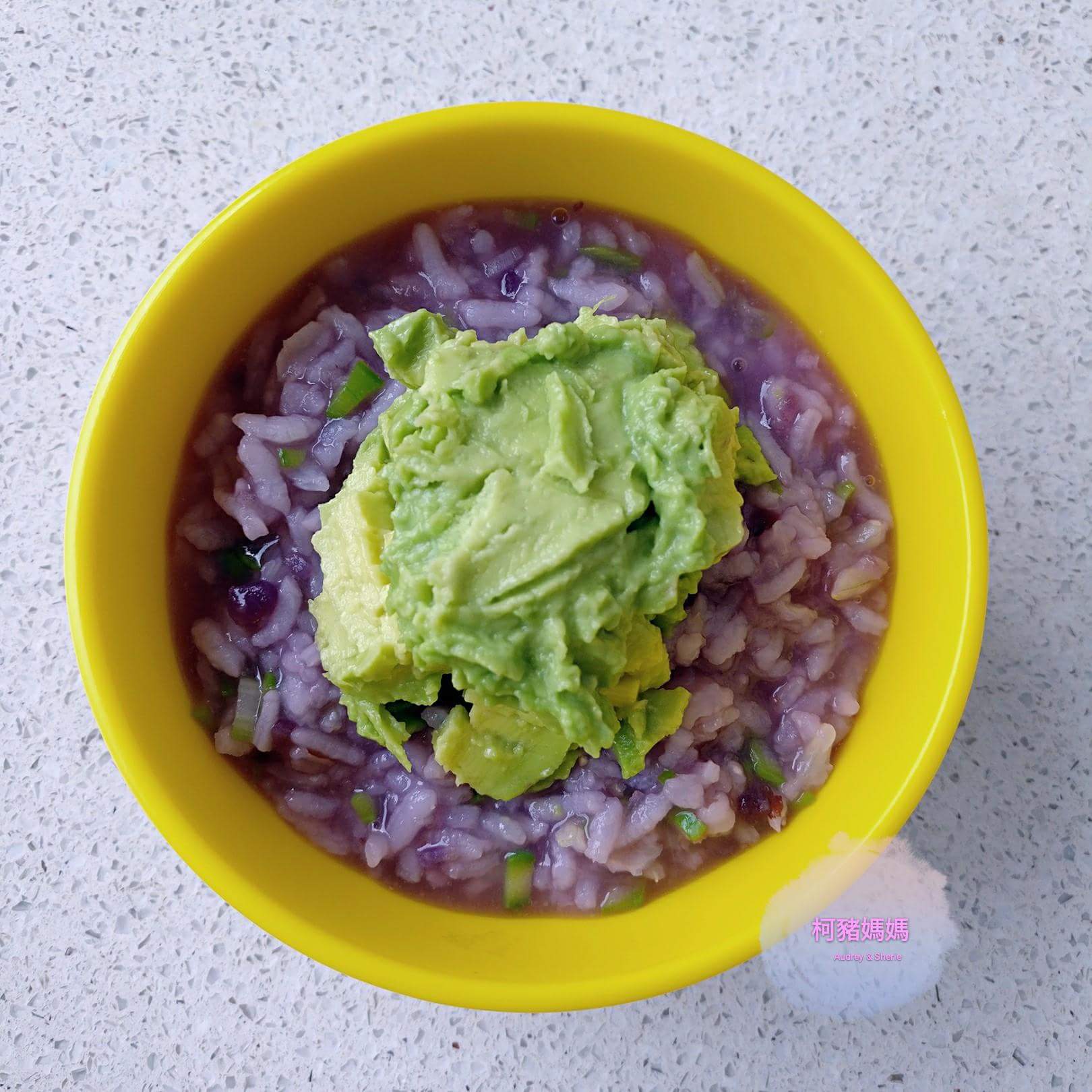 - 用不痴底的小煲,中火,落300ml水,煲滾。落紫薯&飯,轉小火,煮10分鐘。倒入蘆筍煮到收剩1成水份,熄火,牛油果放面,完成。