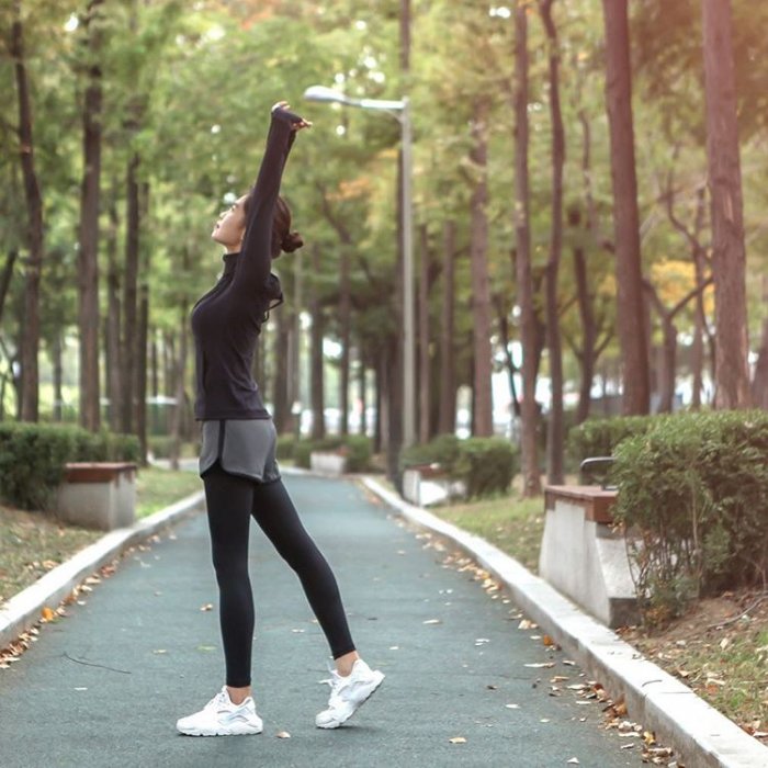 在充分暖身後執行「雙腳打開後跳躍」的動作,這組動作可燃燒全身脂肪,技巧是在跳躍同時要緊縮腹部,著地時可強化背部肌肉,舉手時則可鍛鍊到肩膀肌肉。這組動作需做10次。