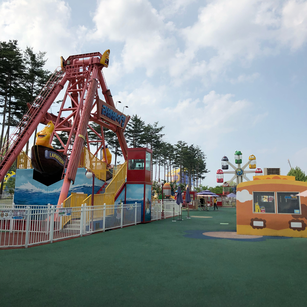 Larva主題公園濟州都有一個,那個是比較大一點的,小編要介紹的是另一個,它是位於忠州的,是濟州的縮小版兒童樂園,裡面的設置,都是Larva的造型,有小小的蟲蟲摩天輪和雲霄飛車等等,不玩打卡拍照都很逗趣的!