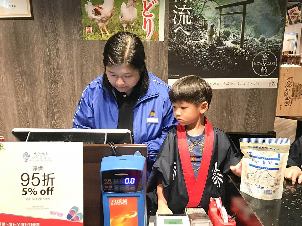平時小朋友很喜歡玩模擬收銀遊戲,今次難得機會來讓小朋友幫超市客人結帳!各位參與的大人獲發一張超市$10現金劵,可以在超市購物讓小朋友收錢 (溫馨提示:這環節是自由參加,而且這是真實的過程,購買的所有商品均不獲退款)