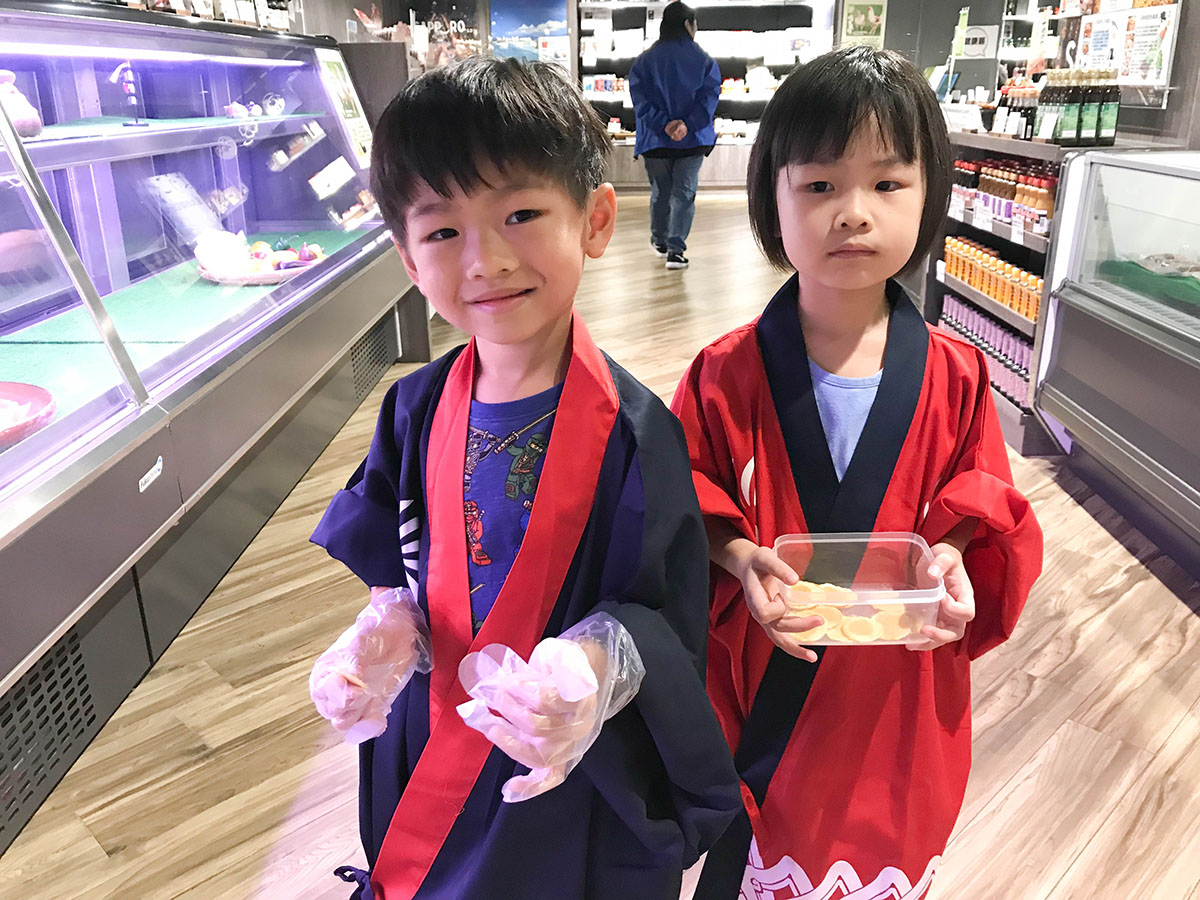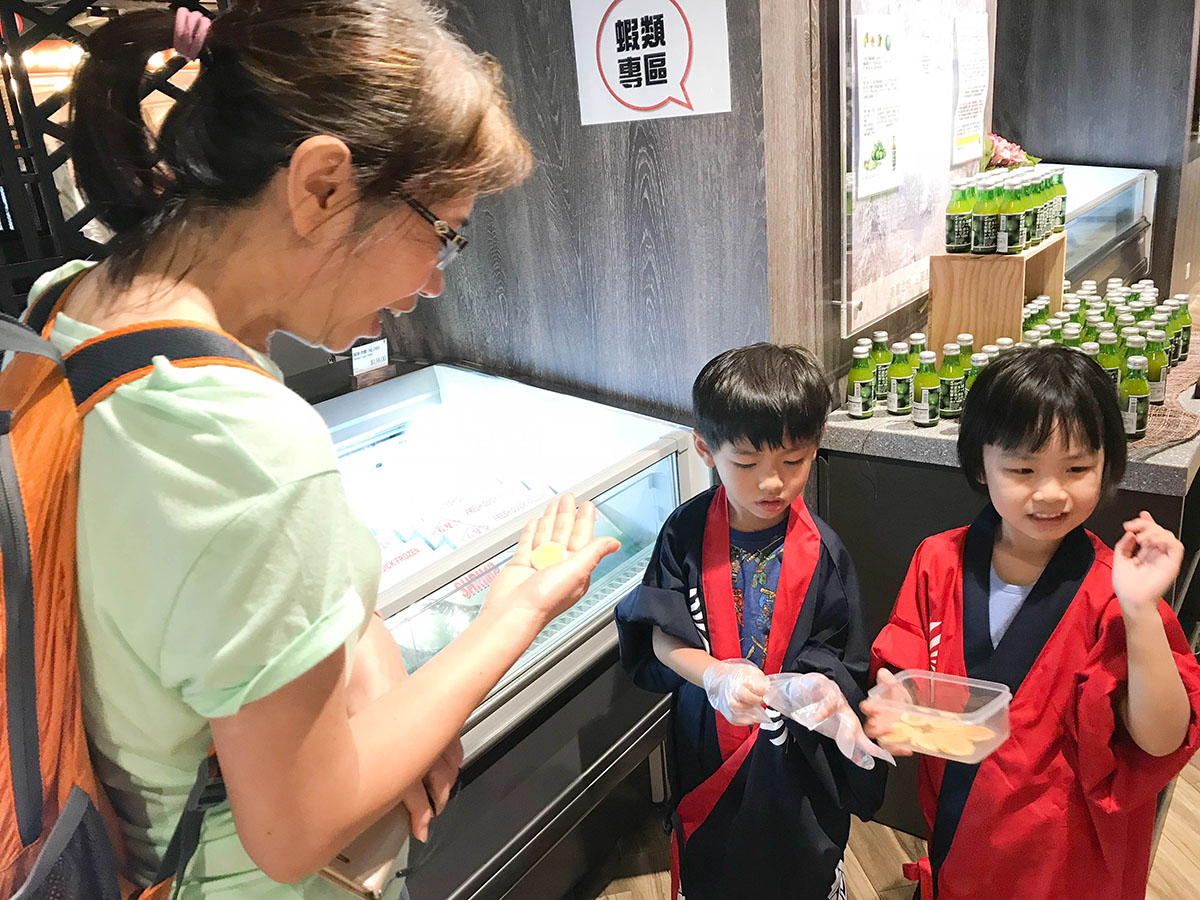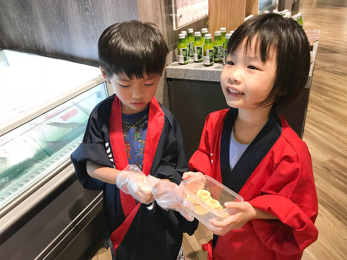 九號水產有小店員大體驗和小侍應大滋味兩種不同的職業體驗,3歲多的楊小寶和6歲的小表姐一起參加了小店員大體驗。