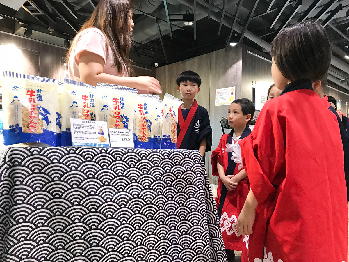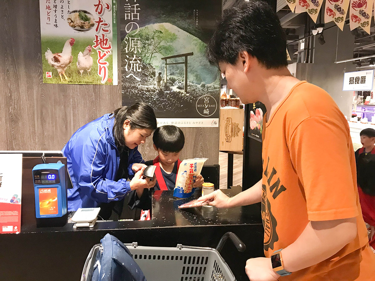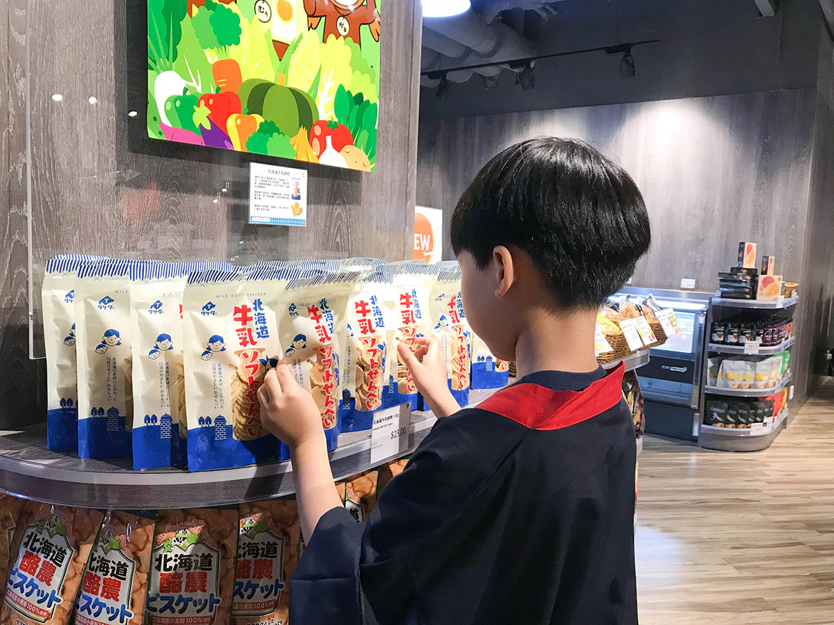 我們買了北海道牛乳餅乾,讓小朋友嘗試收錢的過程! 用真收銀機把商品 "嘟" 一 "嘟"。