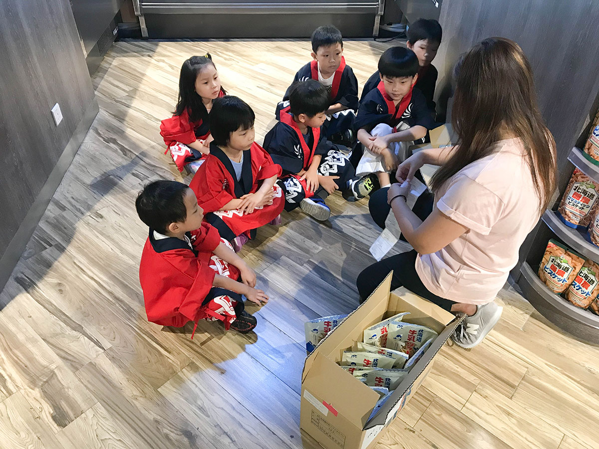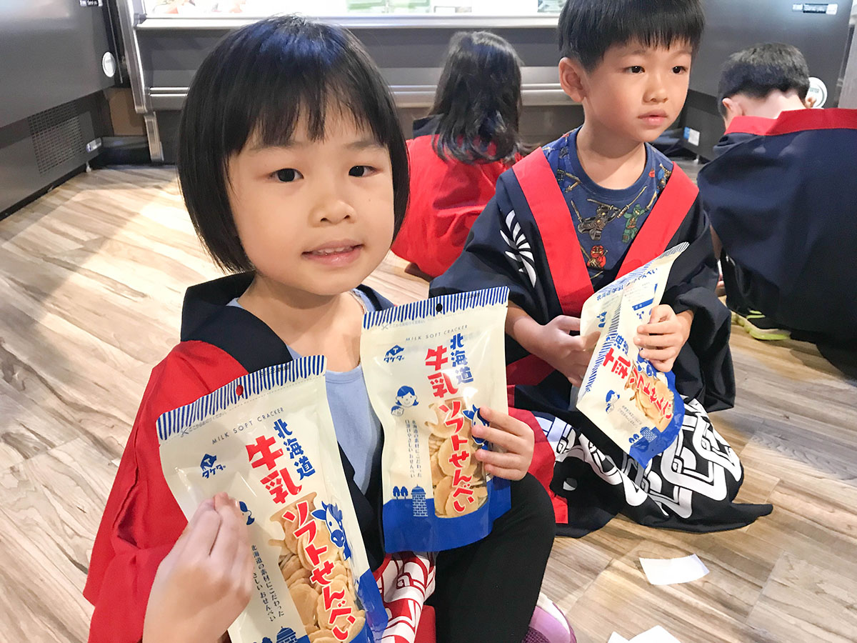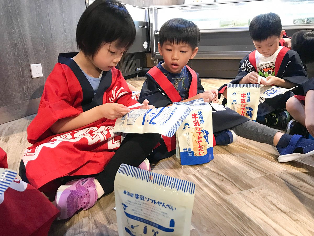 我們買了北海道牛乳餅乾,讓小朋友嘗試收錢的過程! 用真收銀機把商品 "嘟" 一 "嘟"。