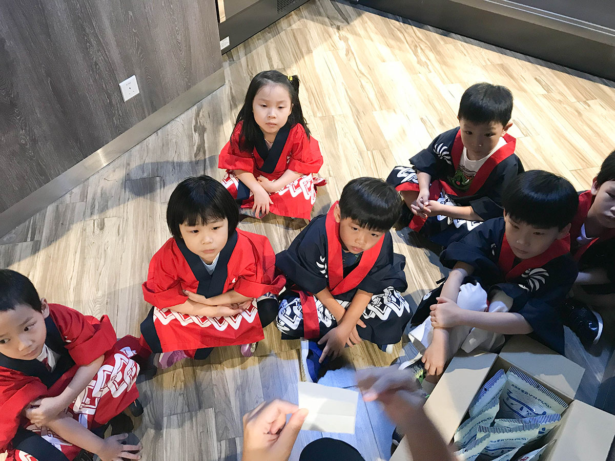 準備好了!在門口先例隊向客人打招呼~ 因為這是日本超市,所以小店員也要學習一句日語「 歡迎光臨, いらっしゃいませ」雙手放前再加一個躹躬~ (在場的父母也忍不住大叫卡娃兒呢~~~)