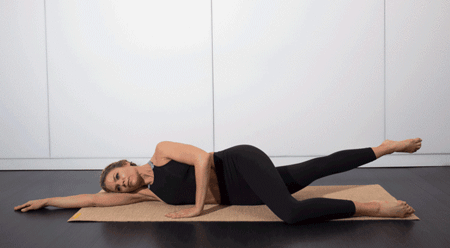 躺下來,右支手撐著頭,左腿跨過右腿,用力把右腿盡量向上抬起。每次做20下,兩邊腿各做做2次。