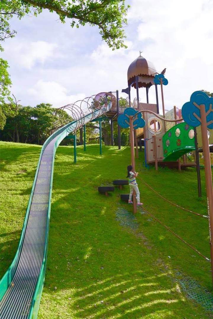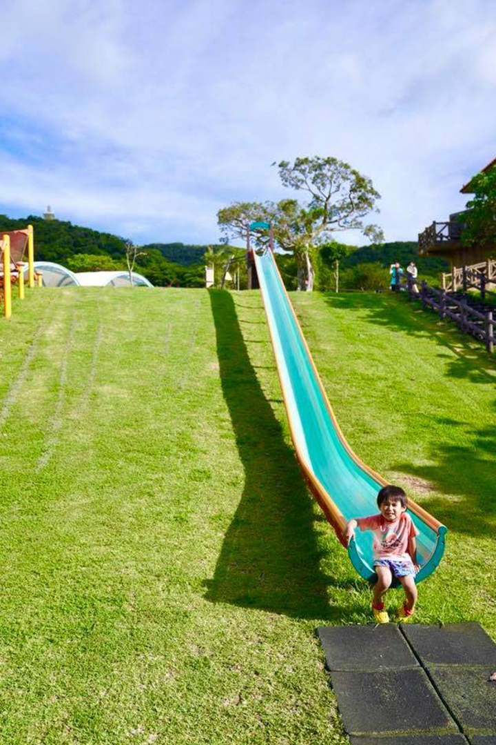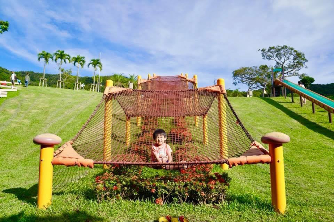 子供廣場設有各式各樣的滑梯,全部都又高又長的,所以比較適合三歲以上的小朋友。綠油油的草地加上沙池攀石牆,絕對是小朋友放電的好去處!