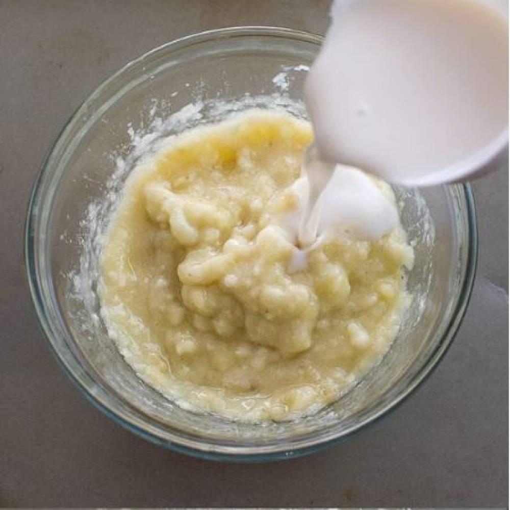香蕉去皮。在杯內用勺子壓成糊狀。
