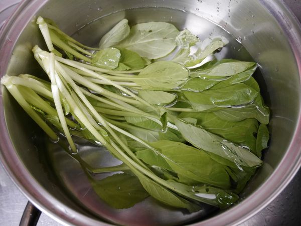 再切成一段一段的,然後放到水裡川燙幾分鐘,就和米糊一起打,