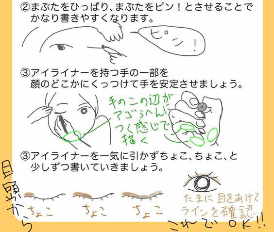 畫眼線的手勢也很重要!在畫的時候一隻手拿著眼線筆,另一隻手要幫助按住眼皮,畫的手用手腕依靠在臉上作支撐!圖中3個綠色圖的位置都在貼在臉上,手就不會抖,畫出來就不會歪啦~從眼頭開始,先畫一點點,再慢慢駁長,就可以畫到一條直又飽滿的眼線啦~