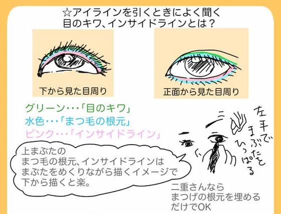 大家看到下圖中的三種顏色了嗎?粉紅色就是內眼線,在眼睫毛之下,白白的線就是內眼線!粉藍色的就是上內眼線,就是睫毛與睫毛之間的空隙啦~綠色的是外眼線,就是平常大家在貼近睫毛根部畫眼線的位置,眼睛向下看就會看到!